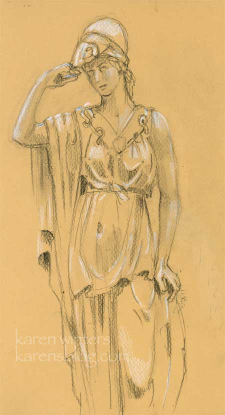 Hinc, quemadmodum ratiocinari didicisset, deinque dispensator factus esset, omnia diligenter curiosus pictor cum inscriptione reddiderat. In deficiente vero jam porticu mento levatum in tribunal excelsum Mercurius rapiebat. Praesto erat Fortuna cum cornu abundanti et tres Parcae aurea pensa torquentes.